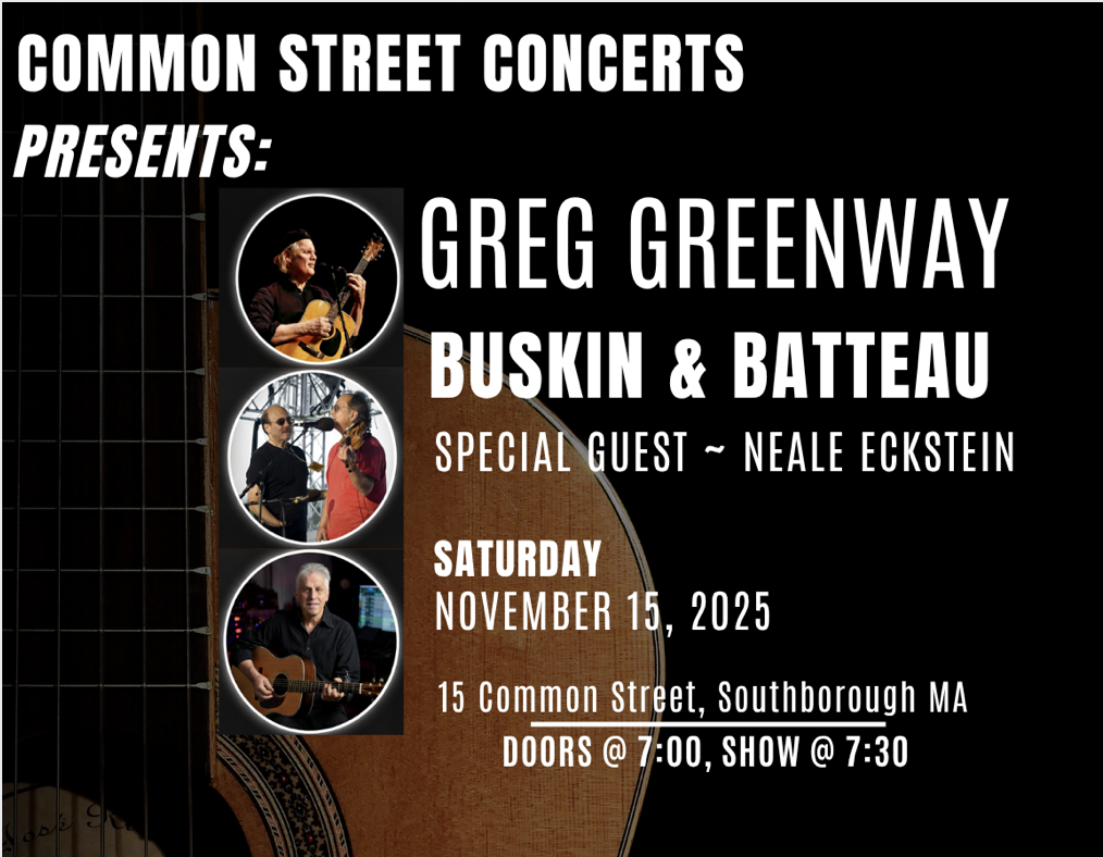 Join us Saturday November 15th for Greg Greenway, Buskin & Batteau, and Neale Eckstein at 7:30 pm at Common Street Concerts!